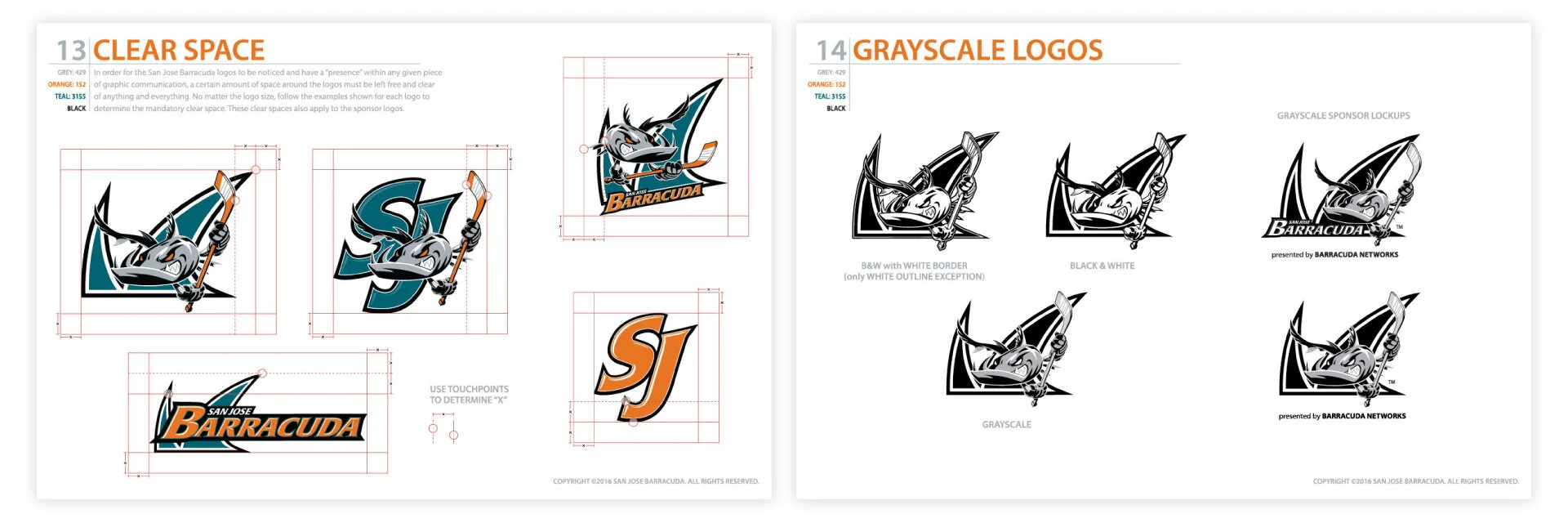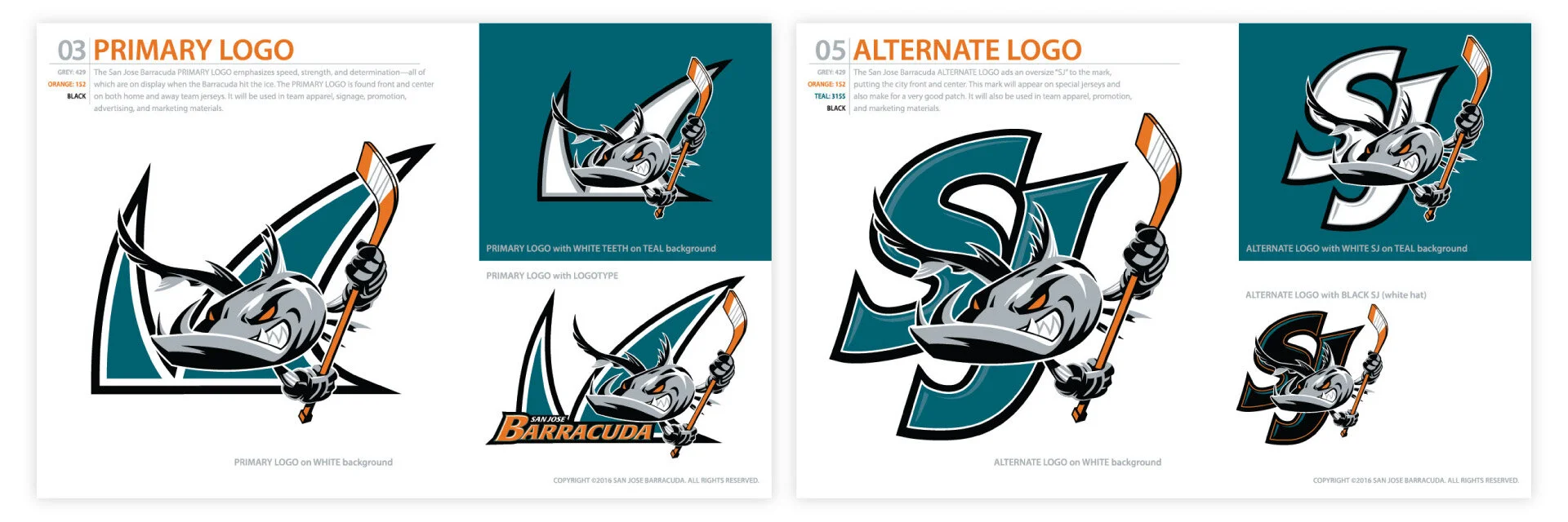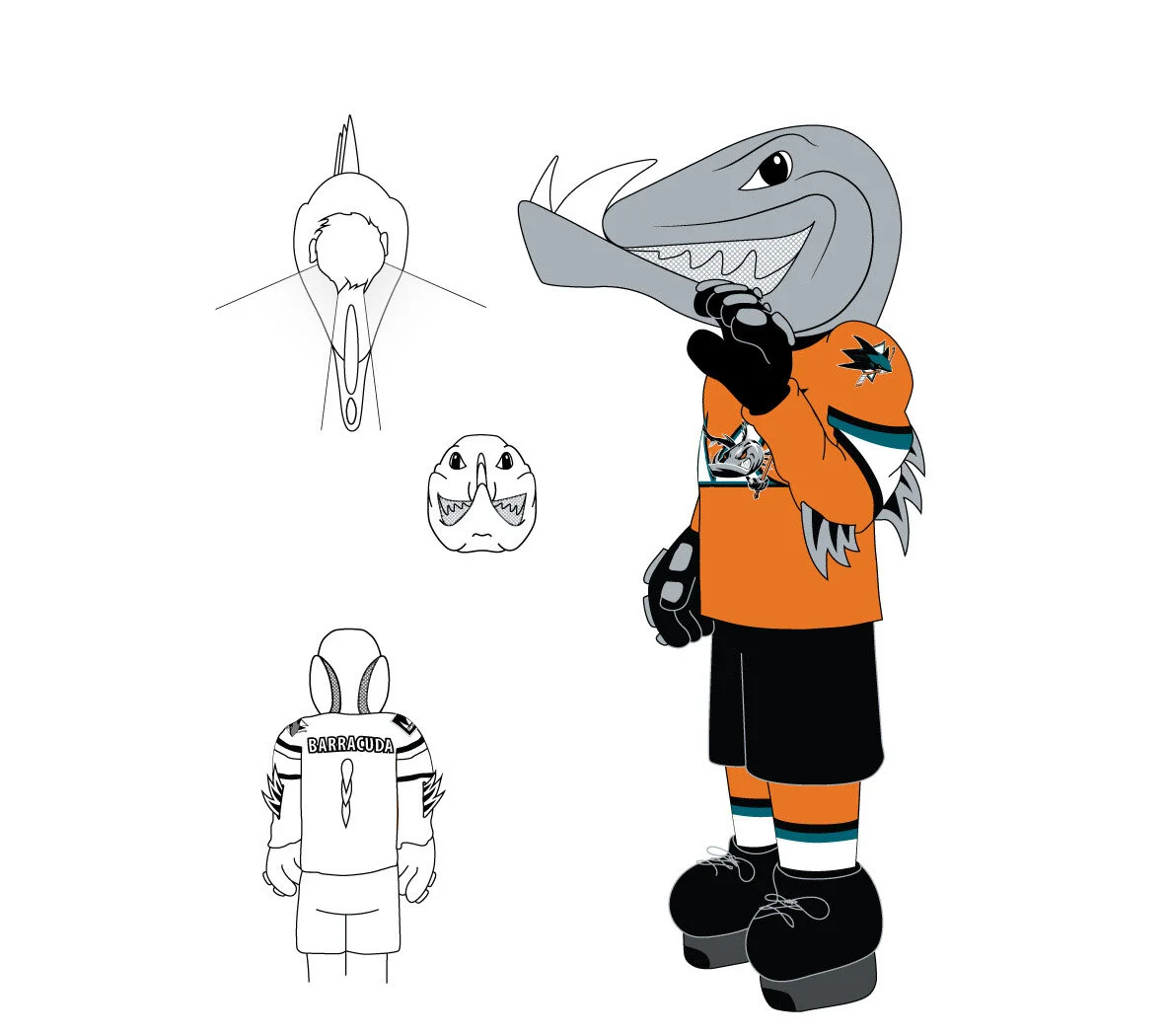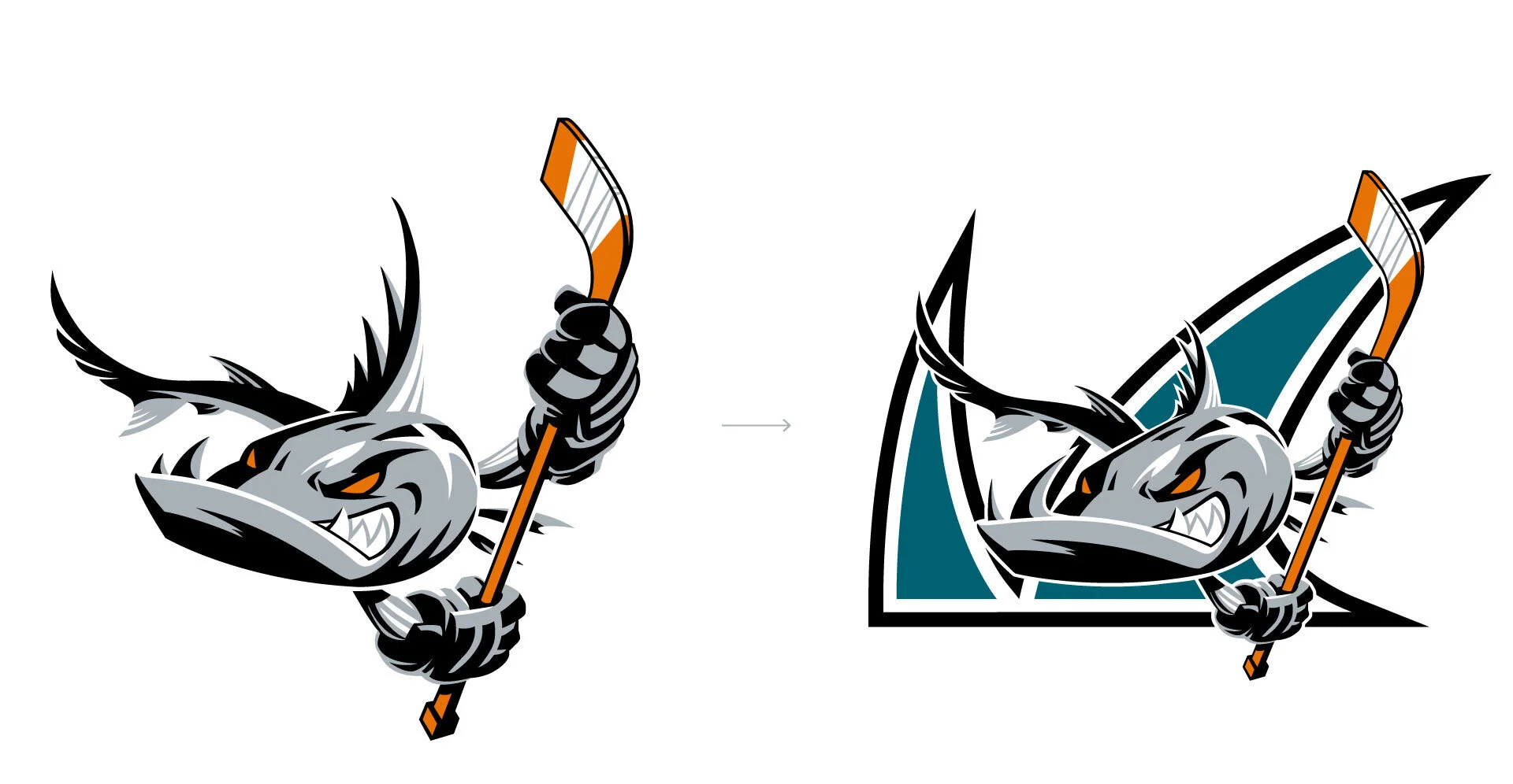 Terry Smith, creator of the San Jose Sharks logo, provided the original logo on the left (above). Barracuda Networks needed to integrate the Barracuda Networks “teeth” logomark as the fish’s teeth and background crest, so I stepped in to help.